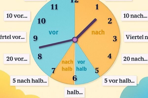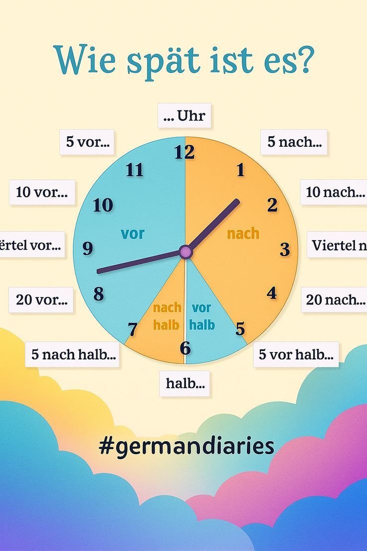 Zeit Minuten —- minutues Sekunden. Seconds Uhr. Time Wand uhr. Time in clock Armband uhr. Time in wristwatch Vorgestern day before yesterday Gestern. Yesterday Heute. Today Morgen. Tommorrow Übermorgen. Day after tommorow Der tag = 24 stunde -24 hours Der minuten. =60 sekunden Der stunde = 60 minuten Here is a comprehensive list of 50…
